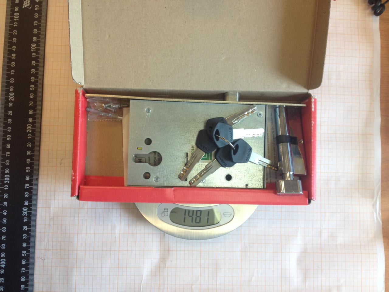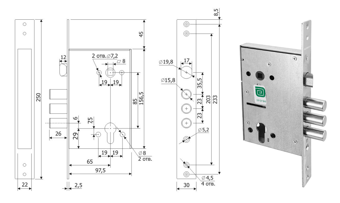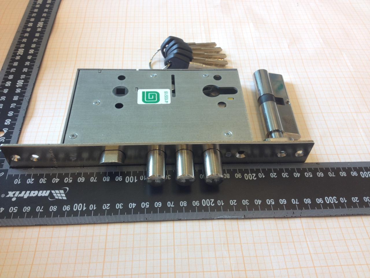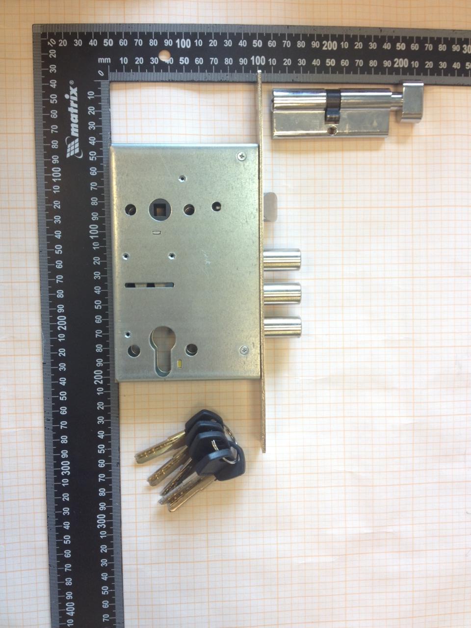 Два оборота, вылет ригелей - 26 мм. Баксэт - 65 мм